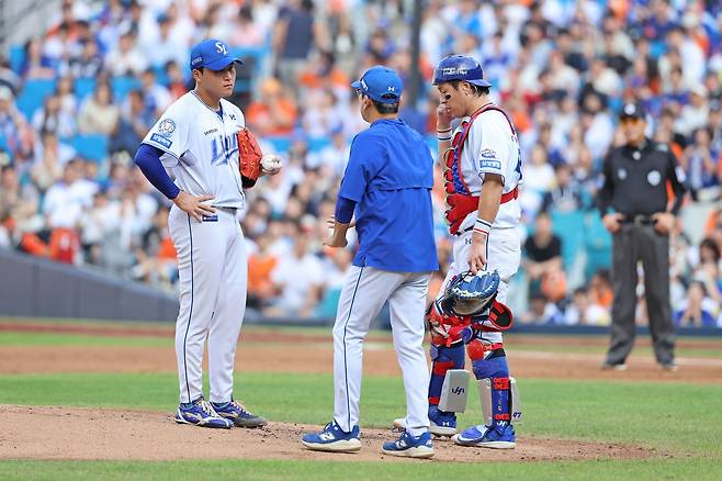 삼성은 6일 한화와 홈 1차전에서 4-7로 패했다.