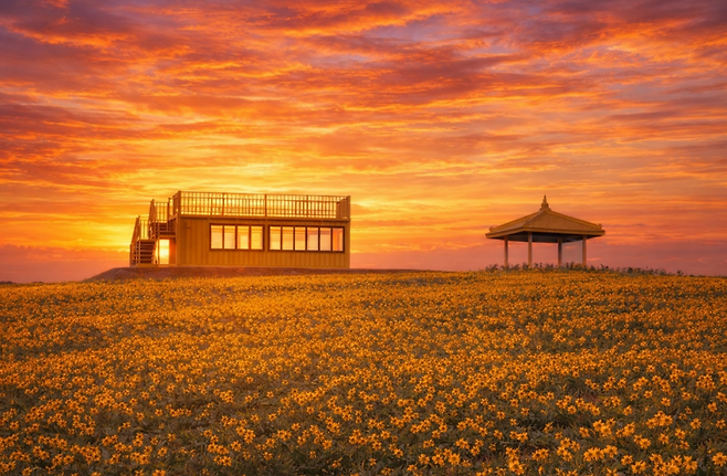 선도의 또 다른 매력은 ‘색’입니다. 단순히 꽃만 노란 게 아니에요. 지붕, 가로등, 정류장까지 마을 곳곳이 노란색으로 통일되어 있습니다. 그래서 이곳은 하나의 테마 공간처럼 느껴집니다.
