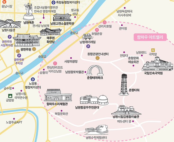 벚꽃과 춘향제 사이의 남원을 찾았습니다. 남원 관광의 핵심은 요천을 중심으로 한 광한루원과 남원관광단지에 있습니다. 한국관광공사는 ‘2025-2026 한국관광 100선’에 남원관광단지를 새로이 포함시켰습니다. 남원관광단지에는 춘향테마파크를 비롯해 남원시립김병종미술관, 남원항공우주천문대, 함파우소리체험관을 비롯해 숙박업소, 갖가지 먹거리가 모여 있습니다. 요천을 건너면 광한루원, 한옥 체험이 가능한 남원예촌, 옛이야기를 즐길 수 있는 남원고전소설문학관이 있습니다.