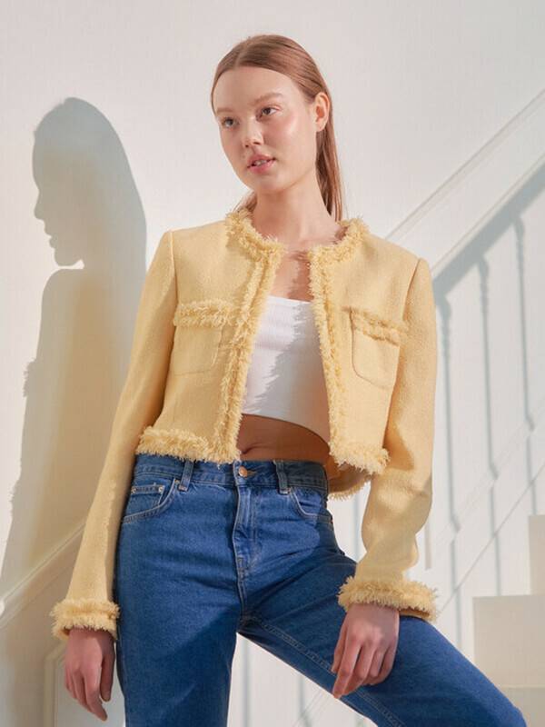 벰버는 자유로움과 여성성에서 영감을 받은 디자이너 브랜드이다. 패션과 일상의 경계에서 자연스러운 아름다움을 발견한다. TASSEL POINT TWEED JACKET은 수술 디테일이 특징인 라운드넥의 트위드 재킷이다. 상큼한 옐로 컬러의 고급스러운 트위드 원단을 사용해 유니크하다. 크롭 기장으로 활용도 높게 사용할 수 있겠다.