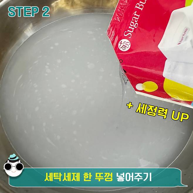 치약물을 만들었다면 세탁세제 한 뚜껑을 추가해주세요. 바로 이 단계에서 세정력을 UP 시켜봅니다요.