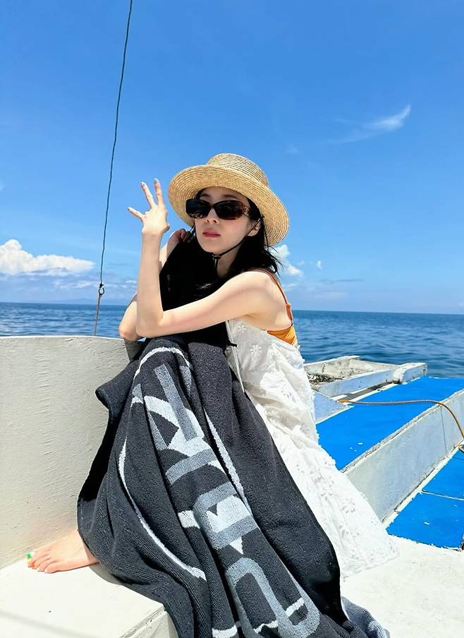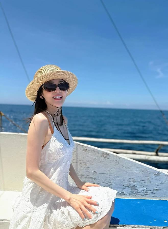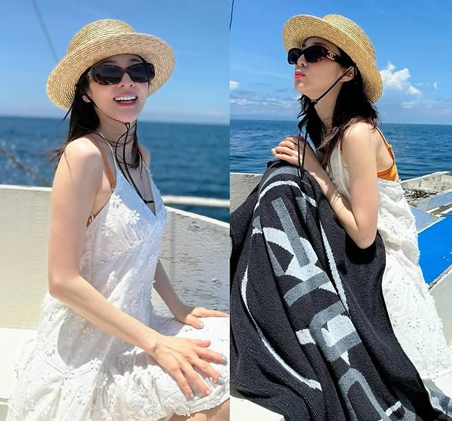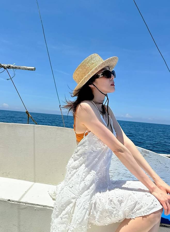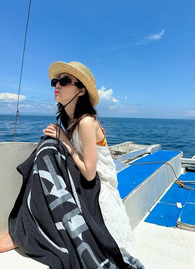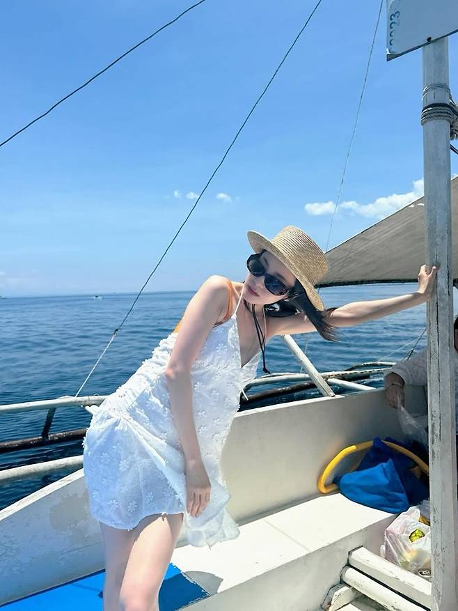 공개한 사진에서 산다라박은 필리핀 보홀 바다의 배에서 화이트 민소매 원피스에 밀짚 페도라햇과 선글라스를 매치한 핫섬머룩으로 여행 스타일을 완성했다.