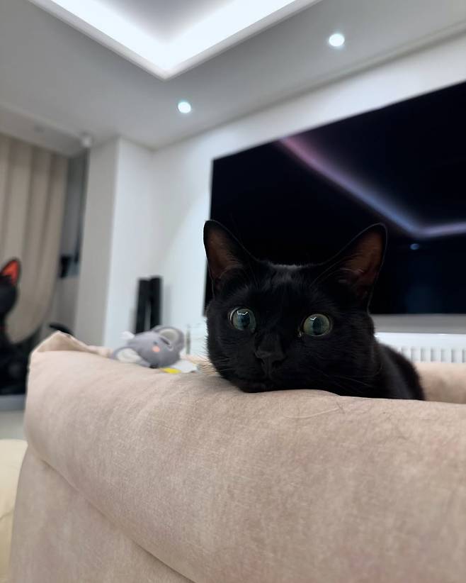 하지만 팬들의 시선을 강탈한 건 따로 있었다. 바로 뒤편 소파 위, 커다란 눈을 한 채 멍하게 상황을 지켜보는 반려묘 다홍이다.