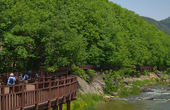 강변 계곡의 물소리와 기암괴석을 따라 평탄한 데크길을 걷는 코스로, 여름에는 시원한 물줄기를 곁에 두고 걸을 수 있습니다.
