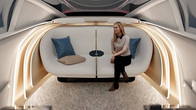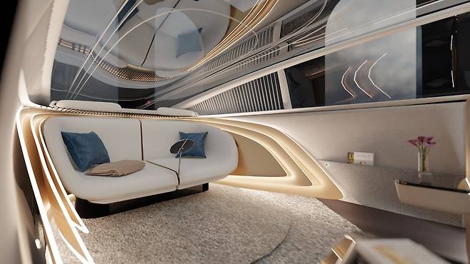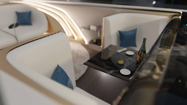 내부는 좌석과 수면 전용 구역이 있고, 식사와 미팅을 위한 두 번째 구역이 있다. 특히 유리 천장은 프라이버시 강화를 위해 불투명하게 변하며, 프라이버시를 위해 의도적으로 벨트라인을 높게 설계했다.