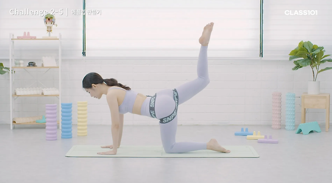 이번에는 다리를 접은 상태에서 뒤로 들어줍니다. 다리를 접어서 내 등과 허벅지가 수평이 될 수 있도록 맞춰주며 엉덩이의 자극을 느낍니다. 이 역시 양쪽 다리 모두 10회씩 반복합니다.
