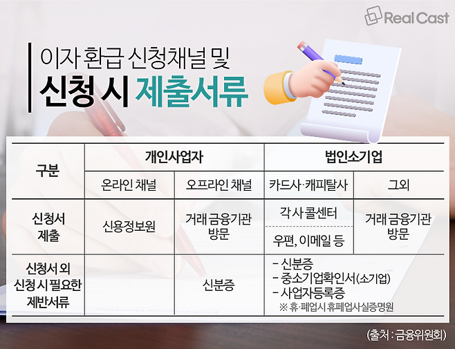 개인사업자인 경우, 거래 금융기관을 방문하지 않아도 신용정보원 온라인 신청시스템(18일부터 개시)을 통해 신청이 가능합니다. 단, 이자 환급 신청자가 몰리며 서버 다운 등의 문제가 발생할 수 있는 만큼 신청기간 초기에는 출생연도 끝자리 5부제를 실시하여 수요를 분산시킬 계획입니다.