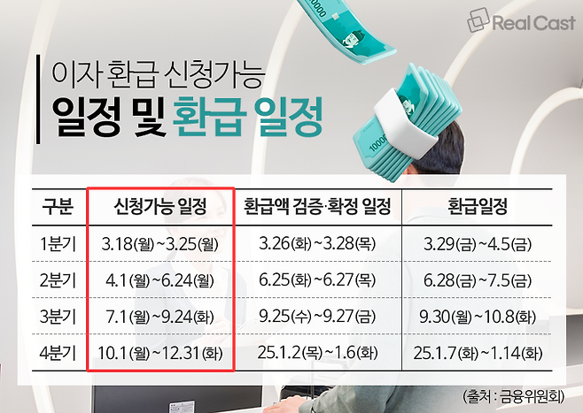 대출자의 환급금액을 검증, 확정하는 시기(분기마다 3영업일)를 제외하면 언제든 신청할 수 있으며 이자 환급은 이달 29일부터 진행됩니다. 환급 가능여부, 지급금액 및 지급시기 등은 신청순서에 따라 달라지지 않습니다. 더불어 1분기 말 환급대상이지만 3월에 신청하지 못한 차주라도 3월 이후 언제든 신청하면 신청일 이후 도래하는 분기 말에 환급을 받게 됩니다.