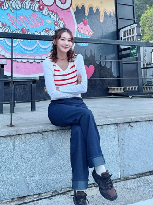 레드 스트라이프가 포인트인 화이트 티셔츠에 와이드 데님 팬츠를 매치해 프렌치 감성을 살렸다.