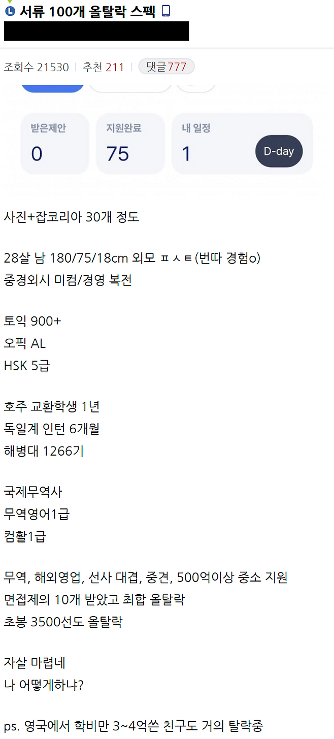 서류 100개 탈락했다는 사람의 스펙