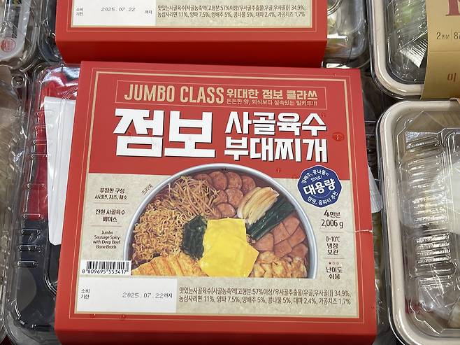 피코크 점보 사골육수 부대찌개는 깊고 진한 사골 육수에 햄, 소시지, 떡, 야채 등이 어우러진 4인용 밀키트에요.