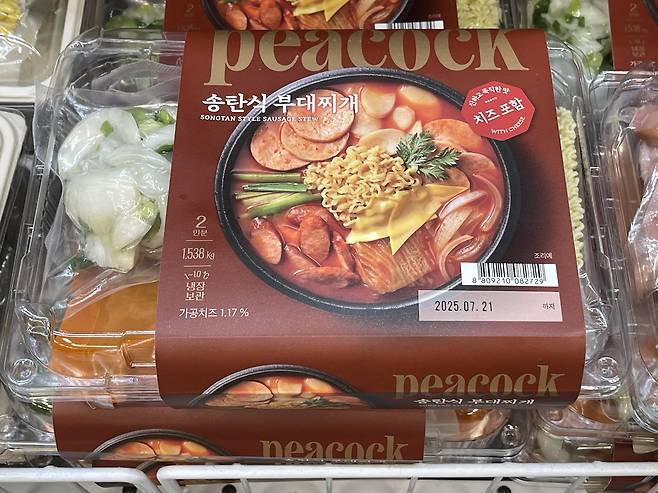 피코크 송탄식 부대찌개는 햄, 소시지, 떡, 콩 등 부대찌개 재료와 국물이 조화를 이루는 2인용 밀키트에요.