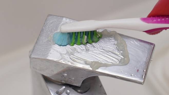이럴 땐 치약을 묻혀 닦아 주기만 하면 끝이에요. 저는 칫솔에 치약을 묻혀 구석구석 닦아 주었어요. 이땐 부드러운 솔을 이용해 닦아야 수도꼭지에 스크래치가 나지 않으니 주의하세요.