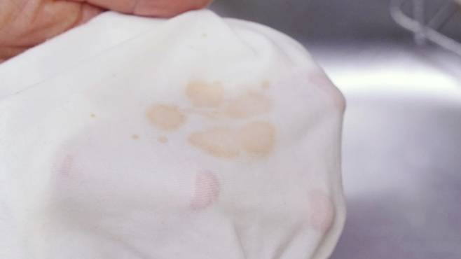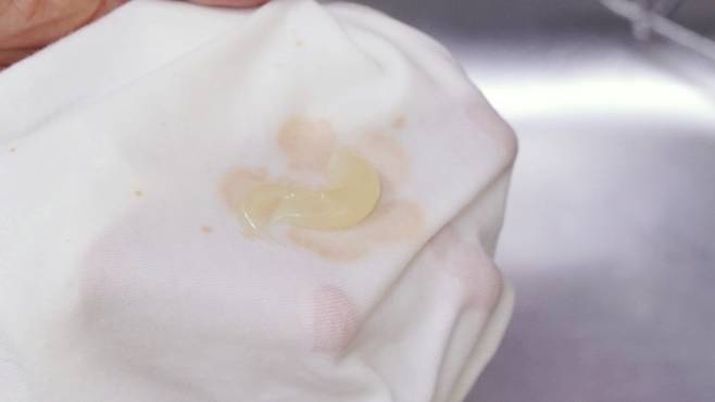 마지막은 김치국물 자국이에요. 흰옷에 김치국물 자국 튄 적 가끔씩 있죠. 이럴 땐 일반 세탁으론 지워지지 않아 고생하는 경우가 많이 있는데요.