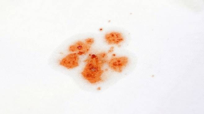 마지막은 김치국물 자국이에요. 흰옷에 김치국물 자국 튄 적 가끔씩 있죠. 이럴 땐 일반 세탁으론 지워지지 않아 고생하는 경우가 많이 있는데요.