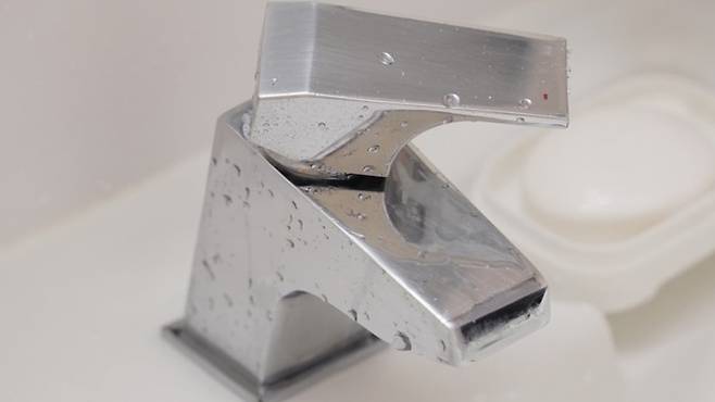 두 번째! 수도꼭지 닦기. 수도꼭지엔 물때가 항상 껴있는 것 같아요. 정말 만지기도 싫을 정도로 더러워 보이는데요.