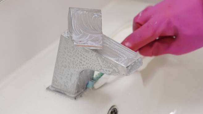 두 번째! 수도꼭지 닦기. 수도꼭지엔 물때가 항상 껴있는 것 같아요. 정말 만지기도 싫을 정도로 더러워 보이는데요.