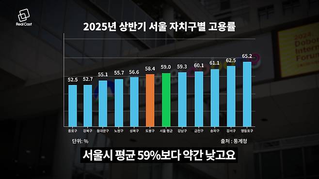 가장 큰 아킬레스건은 바로 자족 기능의 부족입니다. 2025년 상반기 기준 도봉구의 고용률은 58.4%로 서울시 평균(59.0%)보다 약간 낮은 수준입니다. 특히 ‘근무지 기준 취업자 수’는 9만2,000명으로 강북구와 함께 서울 최저 수준에 머물러 일자리 공급이 부족하다는 지적을 받고 있습니다.