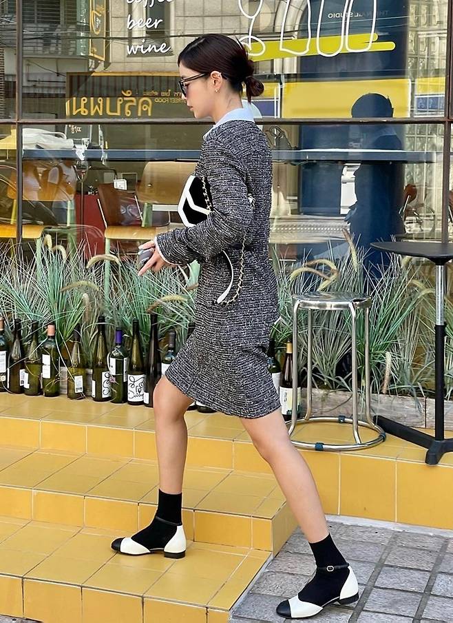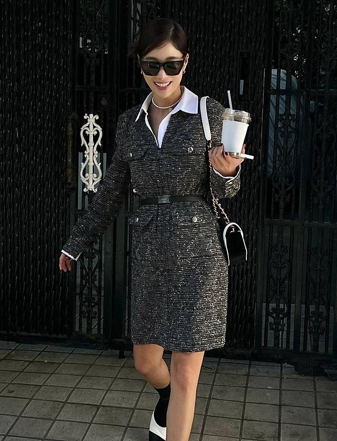 고급스러운 트위드 텍스처와 세련된 컬러가 특징이며 기은세는 벨티드 스타일링으로 날씬해 보이는 패셔니스타의 면모를 마음껏 뽐냈다.