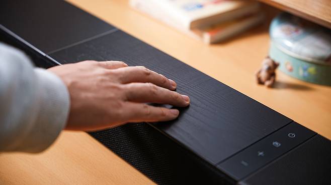 사운드바 조작 버튼은 터치 방식이고 전원, 입력모드, 볼륨 간단한 조작이 가능합니다.