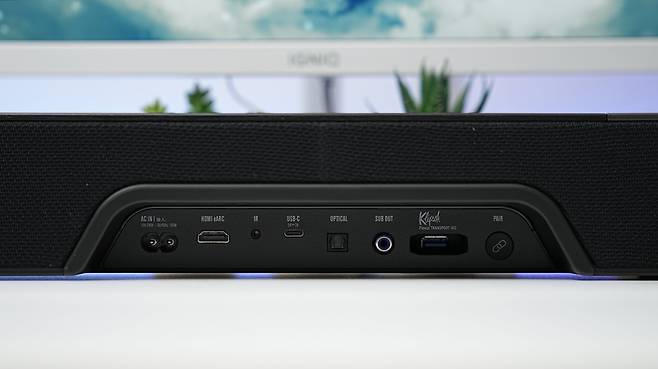 입력 포트는 HDMI(eARC), IR, USB-C, OPTICAL, SUB OUT이 있고 서라운드 스피커와 무선 연결을 위한 Flexus 송신기 포트, 블루투스 5.3 페어링 버튼이 있습니다.