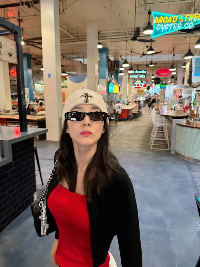 베이지 컬러 캡과 블랙 선글라스, 레드 톱을 조합한 캐주얼 룩으로 일상 속 세련미를 연출하고 있다. 블랙 아우터를 걸쳐 레이어드 스타일링을 완성했으며, 체인백을 포인트 아이템으로 활용해 심플하면서도 트렌디한 감각을 보여주고 있다.