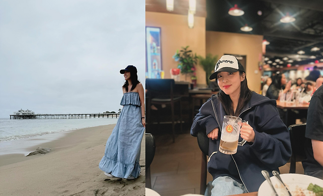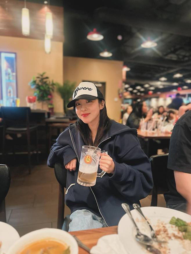 레스토랑에서 네이비 오버사이즈 후드집업과 화이트 캡을 매치해 편안하면서도 스타일리시한 룩을 연출하고 있다. 맥주잔을 들고 있는 자연스러운 모습에서 일상적인 매력이 돋보이며, 스포티한 아이템들로 캐주얼의 정석을 보여주고 있다.
