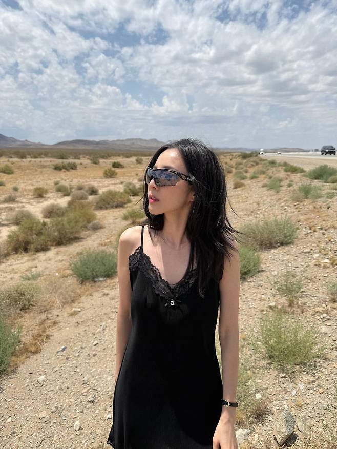 산다라박이 광활한 사막을 배경으로 블랙 레이스 원피스를 착용해 도시적인 세련미를 연출하고 있다. V넥 라인의 레이스 디테일이 돋보이는 슬림핏 원피스는 미니멀한 디자인으로 사막의 거친 풍경과 대조를 이루며 모던한 분위기를 자아내고 있다. 선글라스를 매치해 쿨한 매력을 더했다.