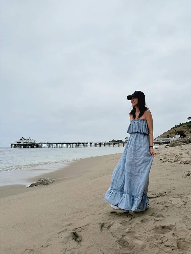해변을 배경으로 라이트 블루 데님 맥시 드레스를 착용해 보헤미안 감성을 연출하고 있다. 오프숄더 디자인과 러플 디테일이 여성스러운 매력을 강조하며, 블랙 캡으로 캐주얼함을 더해 해변가에 어울리는 완벽한 바캉스 룩을 완성하고 있다.