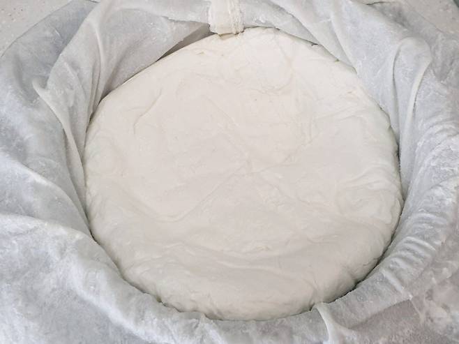 5. 통에 거름망을 올리고 거기에 면포를 얹어서 요거트를 부어준다음 잘 싸서 위에 무거운걸 얹어준 상태로 냉장고에 넣는다(유청빼기)