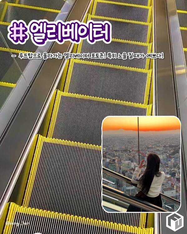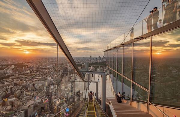 시부야 스카이의 가장 유명한 포토존으로는 루프탑 에스컬레이터가 있습니다. 특히 노을질 때쯤 외부에서 에스컬레이터를 타고 사진을 찍으면 인생 사진을 남기실 수 있으실 겁니다.