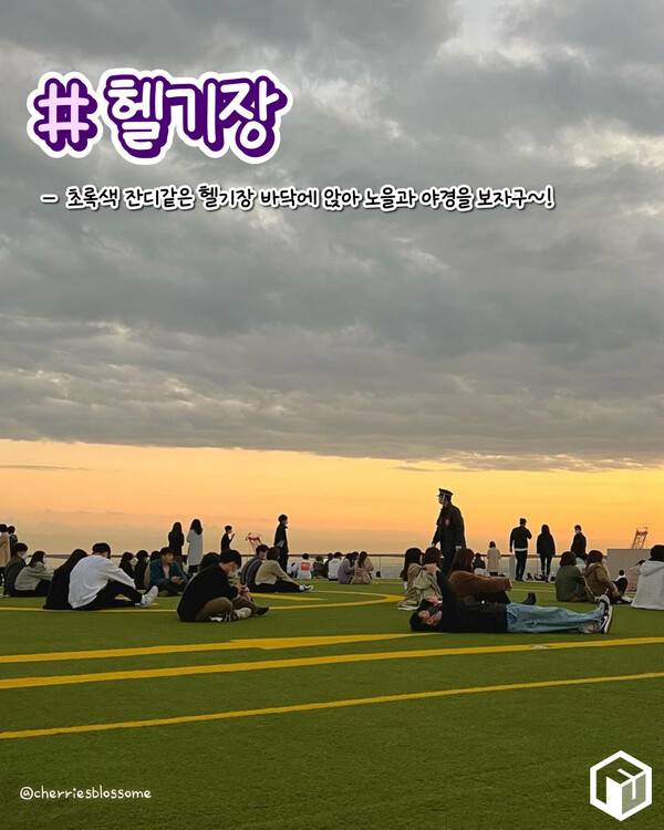 시부야 스카이 헬기장은 푸른 인조잔디로 해가 질 무렵 누워서 노을과 야경을 보면 좋은데요. 강풍에 모자가 날라갈 수 있으니 주의하시길 바랍니다.