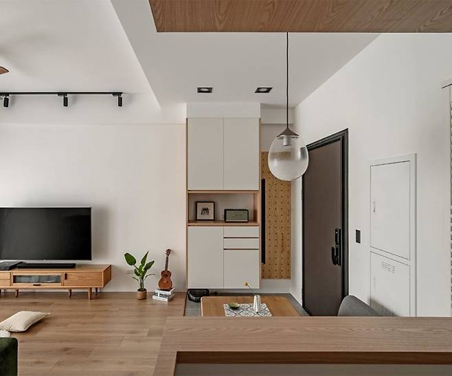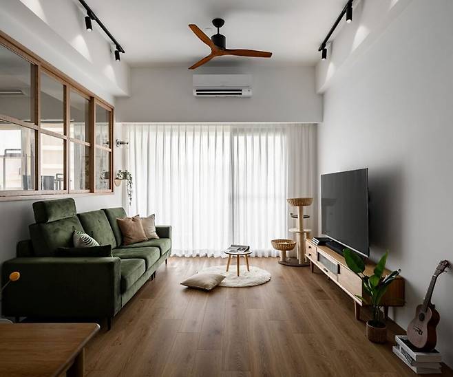 거실은 TV 중심의 수납에서 벗어나, 낮은 원목 가구와 넓은 공간으로 채워졌다. 벽면에는 최소한의 장식이 더해졌고, 대형 창을 통해 들어오는 자연광이 거실을 밝히며 온기를 더한다. 짙은 녹색 소파가 중립적인 색조 속에서 돋보인다.