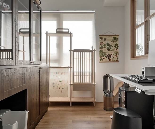 서재는 벽을 제거하고 통유리와 원목문을 설치하여 자연광이 깊게 스며들도록 했다. 덕분에 주방까지도 밝아지며, 전체 공간이 더 넓고 투명하게 느껴진다.