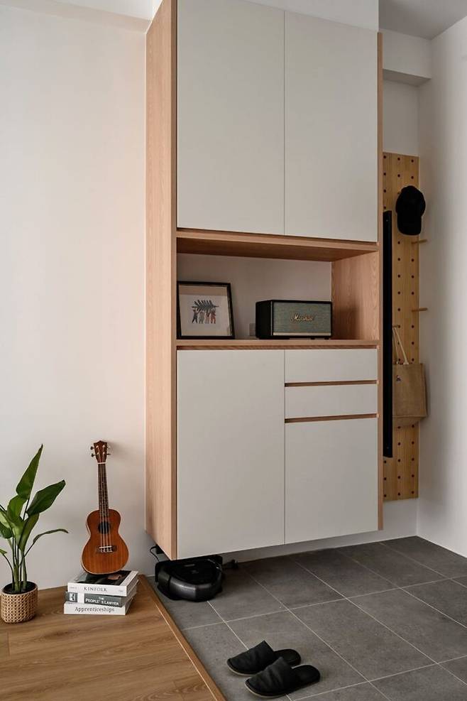 신발장은 바닥에서 띄워 설치되어 아래 공간을 효율적으로 활용했다. 흰 벽면은 깊은 수납 공간을 제공하며, 구멍 뚫린 철판을 깔끔하게 가려 시각적 깔끔함을 유지한다. 집주인의 취향에 맞춰 다양한 오브제를 배치할 수 있도록 설계되었다.