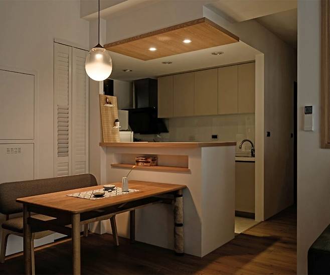 부드러운 베이지 톤의 주방 가구와 천장의 원목 프레임이 따뜻한 일본식 분위기를 조성한다. 펜던트 조명과 중간바 조명은 저녁이 되면 또 다른 매력을 더한다. 기존의 일자형 조리 동선이 확장되어 다양한 가전과 수납을 수용하는 구성이 인상적이다.