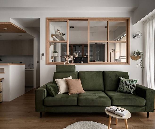 다양한 색상의 책장과 층층이 배치된 고양이 점프대는 3마리 고양이의 동선을 세심히 고려한 설계다. 벽에 설치된 실내창은 채광과 시야 확장 효과를 제공하며, 공간 사이의 연결성을 높인다.