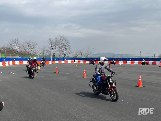 시간 관계상 모든 교육을 똑같이 받을 수는 없어 일부만을 경험해보기로 했다. 첫 번째 교육은 선회를 익히는 것이다. 오랫동안 타와서 별 것 아니겠지 생각했지만, 내 생각이 틀렸음을 깨닫는데는 얼마 걸리지 않았다. 교관의 인솔에 따라 두어 바퀴 워밍업 주행을 마친 후부터는 조금씩 선회가 추가되기 시작한다. 처음에는 선회각이 여유있어 가벼운 마음으로 돌았지만, 서서히 고깔마다 촘촘하게 돌기 시작하며 선회에 필요한 감속과 시선처리, 재가속을 반복하는 과정으로 이어진다. 처음엔 별 것 아니라고 생각했지만, 바퀴를 거듭하면 거듭할수록 그동안 너무 기본기에 소홀했구나 하는 생각이 들며 조금씩 신경쓰기 시작하자 커지기만 하던 회전반경이 조금씩 작아지기 시작한다.