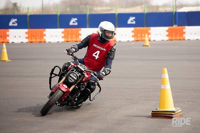 다음으로 제동 교육이다. 모터사이클에서 가장 중요한 건 잘 달리는 것이 아닌, 잘 서는 것이다. 이를 위해 목표에 정확히 멈추는 것, 필요한 때 최대한의 급제동으로 멈춰서는 것, ABS 작동 체험, 제동 과정에서의 회피 등 여러 가지 교육이 이루어진다고. 이 중 가장 기본인 목표에 맞춰 정확히 멈춰서는 과정을 체험해봤다. 자유로운 속도로 맞춰 달리다 브레이크를 꾸준히 잡아 멈춰 세우는 것인데, 두 번을 시도했지만 모두 실패했다. 빠른 속도는 아니었지만 제동력에 대한 판단과 적절한 제동력이 가해지지 않았기 때문. 이에 대해 “제동을 하는 상황은 다양한데, 이런 교육을 통해 멈춰 세우는 순간에 재빠른 상황 판단으로 차량을 멈출 수 있는지 아닌지를 판단하고, 멈출 수 있다면 정확한 조작으로 멈춰 세우고, 세울 수 없다면 회피 기동을 할지, 아니면 차량에서 뛰어내릴지를 빠르게 판단해야 크게 다치는 것을 막을 수 있다”는 것이 교관의 설명.