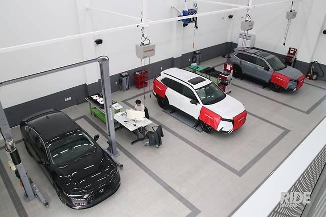1층 끝으로는 조금 독특한 공간이 있었는데, 혼다 자동차와 모터사이클이 줄지어 리프트 위에 올라간 모습이었다. 이곳은 혼다에서 서비스 교육을 진행하는 공간으로, 혼다 자동차와 모터사이클 딜러를 대상으로 신제품 교육과 정비 교육 등을 진행하는 곳이라고 한다. 그동안은 이런 교육은 경기도 평택에 위치한 교육장에서 이뤄졌는데, 이번 에듀케이션 센터 오픈과 함께 여기로 자리를 옮기게 됐다고. 신제품이 나오면 정비 교육도 하고, 넓은 외부 교육장에서 안전하게 시승도 할 수 있으니 여러 면에서 좋은 선택이지 싶다.