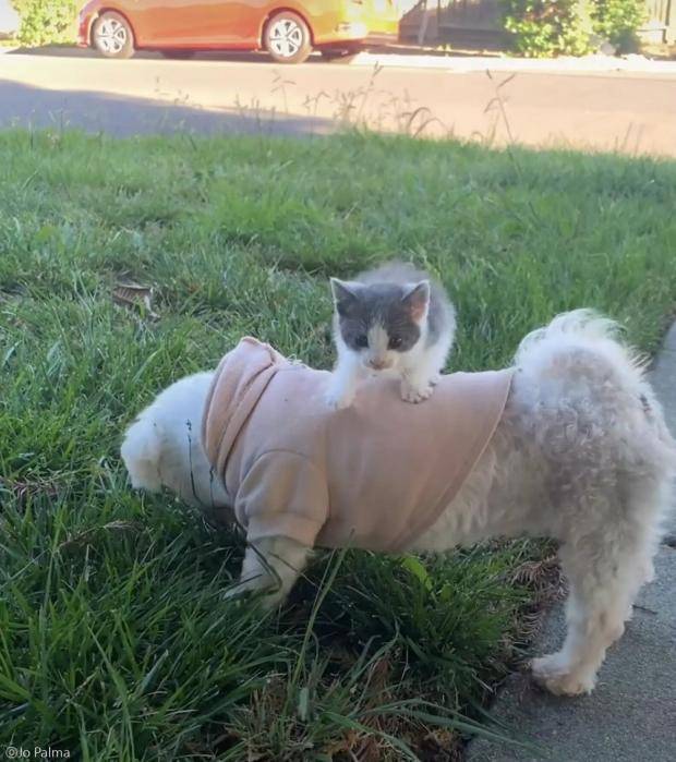 [노트펫] 산책 중인 강아지 등 위에 올라탄 새끼 고양이가 입양되며 묘생역전에 성공했다고 13일(이하 현지 시각) 미국동물매체 더도도가 보도했다.
