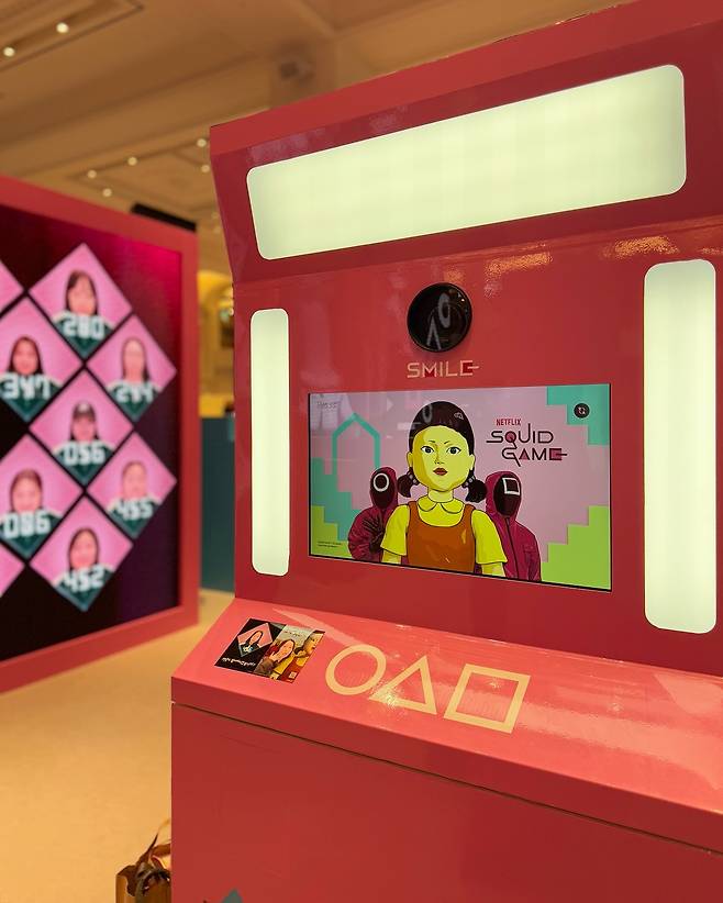 1층 '오픈 스테이지'에 오징어 게임 세트장을 옮겨 놓은 듯한 공간에서 체험형 팝업이 펼쳐진다. 초록색 트레이닝복을 빌려 합숙소 철제 침대에서 인증샷을 찍을 수 있고 작품 속에서 오징어 게임 참가자로 등록하는 사진 촬영을 체험할 수 있는 포토부스도 준비됐다. 18개 협업 브랜드와 오징어 게임을 활용해 개발한 300품목의 굿즈도 전국 5개 점포(강남·본점·센텀·광주·대전)에서 판매한다.