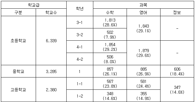 지난 13일 기준 2학기 도입 의사를 사전에 밝힌 학교의 비율은 초교 3학년 수학 7.9%, 초교 4학년 수학 8.0%, 고교 1학년 수학 14.6% 및 영어 14.9%다.