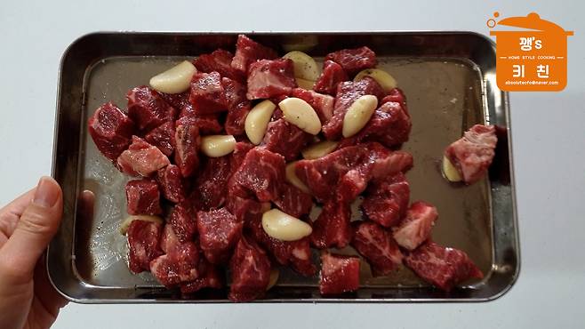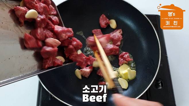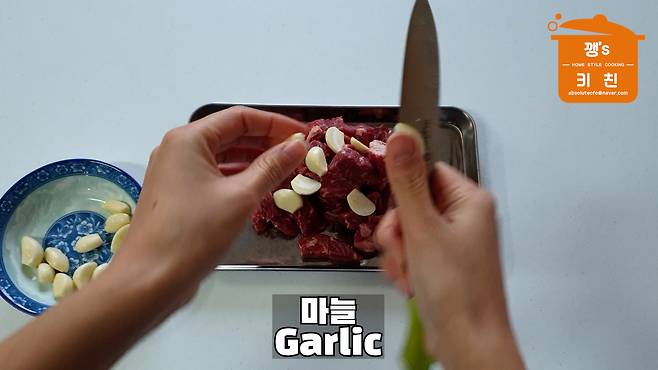 썰어둔 소고기에 마늘을 잘라