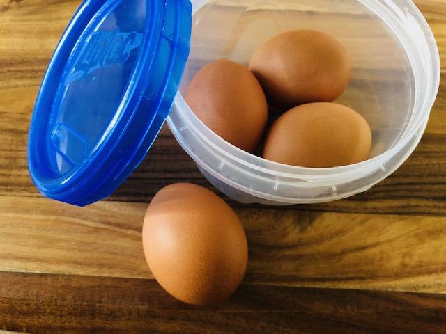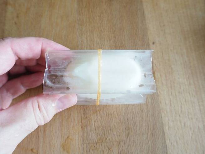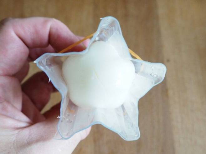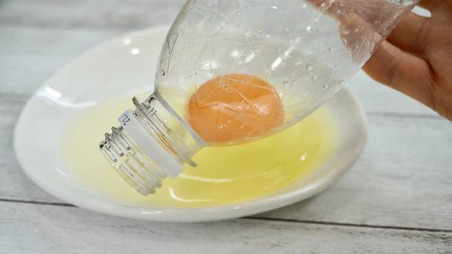 작은 패트병을 활용하면 삶은 계란을 간편하게 보관할 수 있다. 병 입구를 만들기 위해 양쪽을 살짝 절단한 뒤 내부에 계란을 넣고 뚜껑을 닫으면 간단한 밀폐 용기가 완성된다. 별도의 용기가 없어도 충분히 대체가 가능하다.
