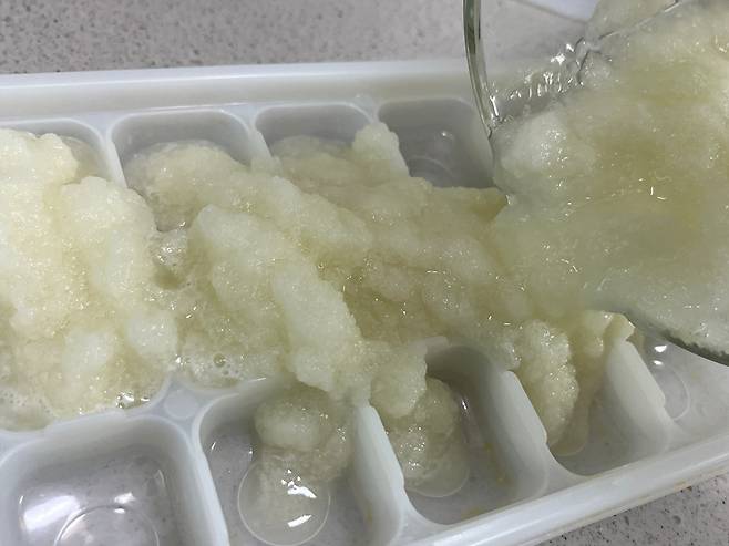 간 무를 얼음틀에 넣으면 소량씩 꺼내서 먹을 수 있어 편리합니다. 소분하여 밀폐 용기나 지퍼백에 담아 냉동해도 좋습니다.