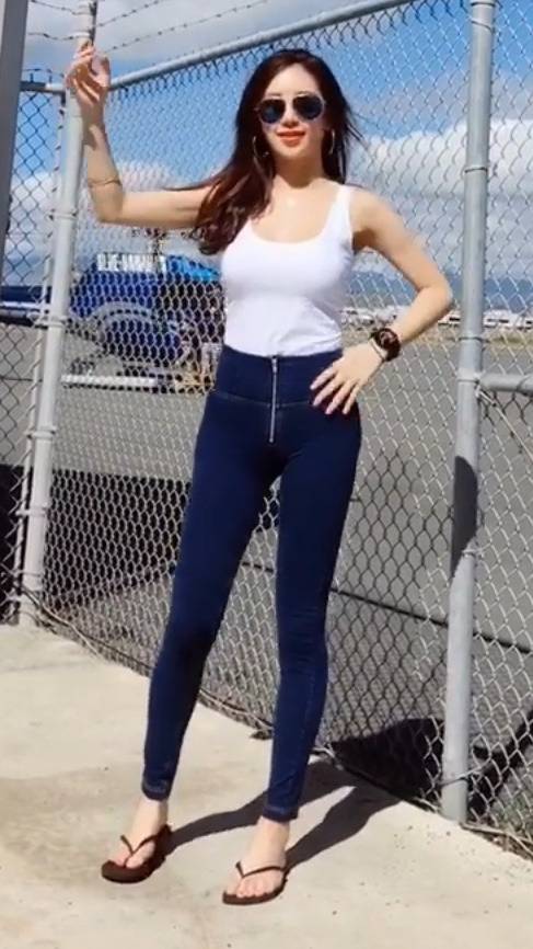 화이트 슬리브리스 탑과 진청 스키니진을 매치해 심플하지만 완벽한 바디 밸런스를 드러냈습니다.