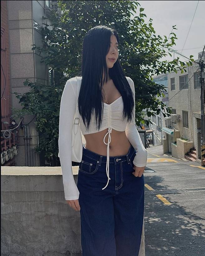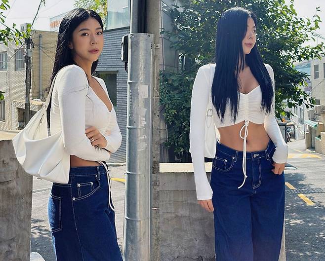 여기에 제이제이는 진청 데님 팬츠를 매치해 스타일리시하고 활기찬 분위기를 자아냈습니다.