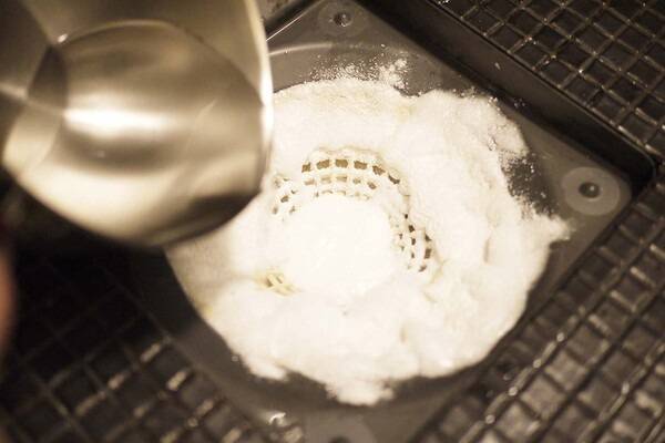 그 위에 식초 1컵을 부어줍니다. 식초는 산성 성분으로, 베이킹소다와 만나면서 거품 반응을 일으키는데, 이때 생긴 탄산 기포가 배관 속 이물질을 분해하고 밀어내는 힘을 줍니다.