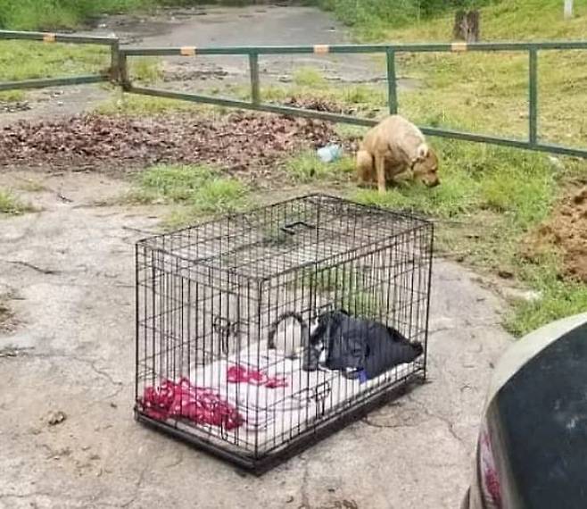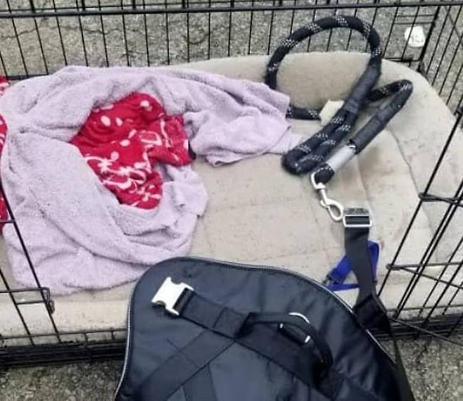 처음 발견될 당시 유기견은 철창 케이지와 함께 발견이 됐다고 합니다. 철창 케이지 안에는 유기견이 쓴 것으로 보이는 담요와 하네스 등이 들어 있었습니다.